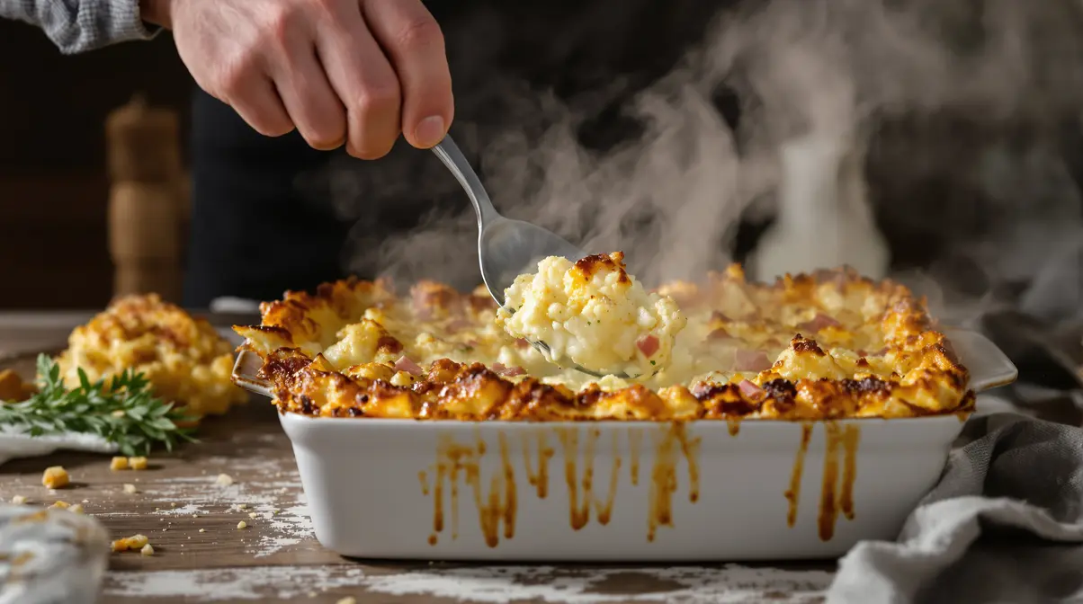 Veel ovenschotels zijn zacht, warm en comfortabel. Lekker, zeker. Maar soms mist er iets. Hier zit juist die fijne spanning in: een zachte bloemkoollaag met ham en kruidenroomkaas, en daarboven een knapperig dak van rösti en kaas.